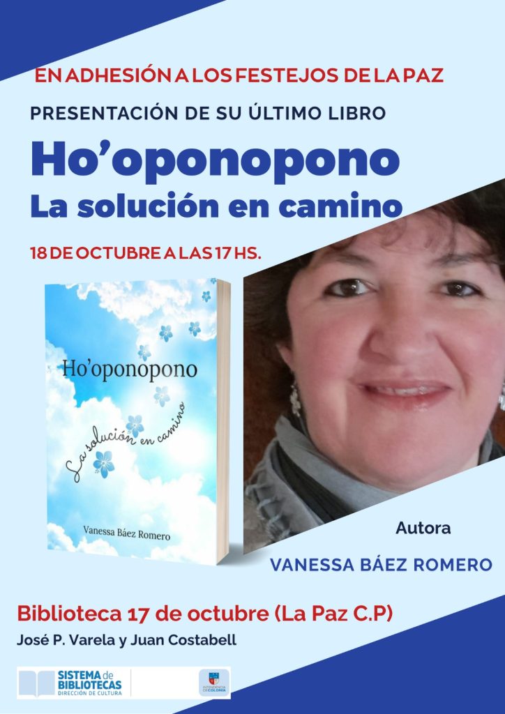 En el marco de las celebraciones del 167º aniversario de Villa La Paz (C.P.), la Biblioteca Municipal “17 de Octubre” invita a la presentación del segundo libro de “Ho’oponopono. La solución en camino” de la escritora y artista plástica Vanessa Báez Romero, quien estará presente recibiendo al público.