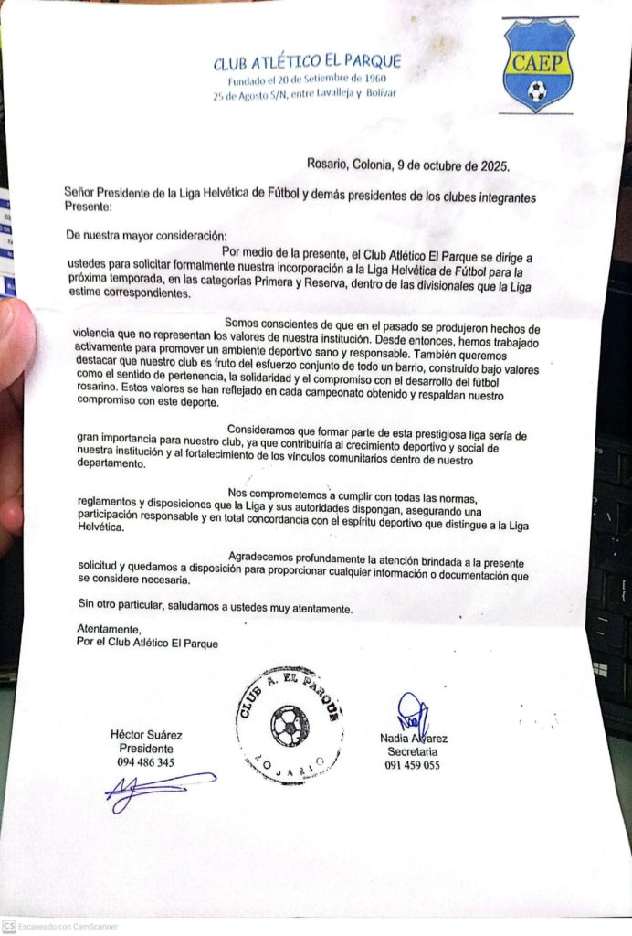 El Club Atlético El Parque de Rosario formalizó su intención de integrarse a la Liga Helvética de Fútbol. La institución presentó una carta dirigida al presidente de la Liga y a las demás autoridades, solicitando su incorporación para la próxima temporada en categorías de Primera y Reserva, o en las divisionales que se consideren correspondientes.