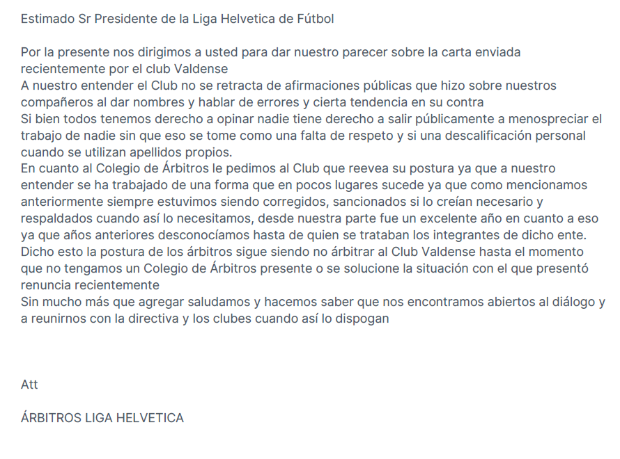 Los árbitros comunicaron al presidente de la Liga que mantienen su decisión de no dirigir partidos del club Valdense, argumentando que la institución no se retractó de declaraciones públicas en las que, según los jueces, se mencionaron nombres y se cuestionó su labor de forma personal. En la nota, los árbitros afirman que se sintieron menospreciados y consideran que el club excedió el derecho a opinar, transformándolo en una descalificación.