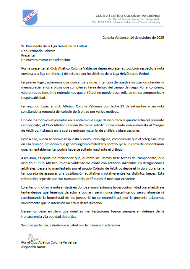Por su parte, Colonia Valdense respondió aclarando que nunca fue intención ofender ni cuestionar la honestidad de los árbitros. Señalan que su reclamo se basó en la falta de respuesta del Colegio de Árbitros tras una reunión en la que habían entregado material para análisis. Además, manifestaron su malestar por la falta de rotación en las designaciones arbitrales en las últimas fechas del campeonato.