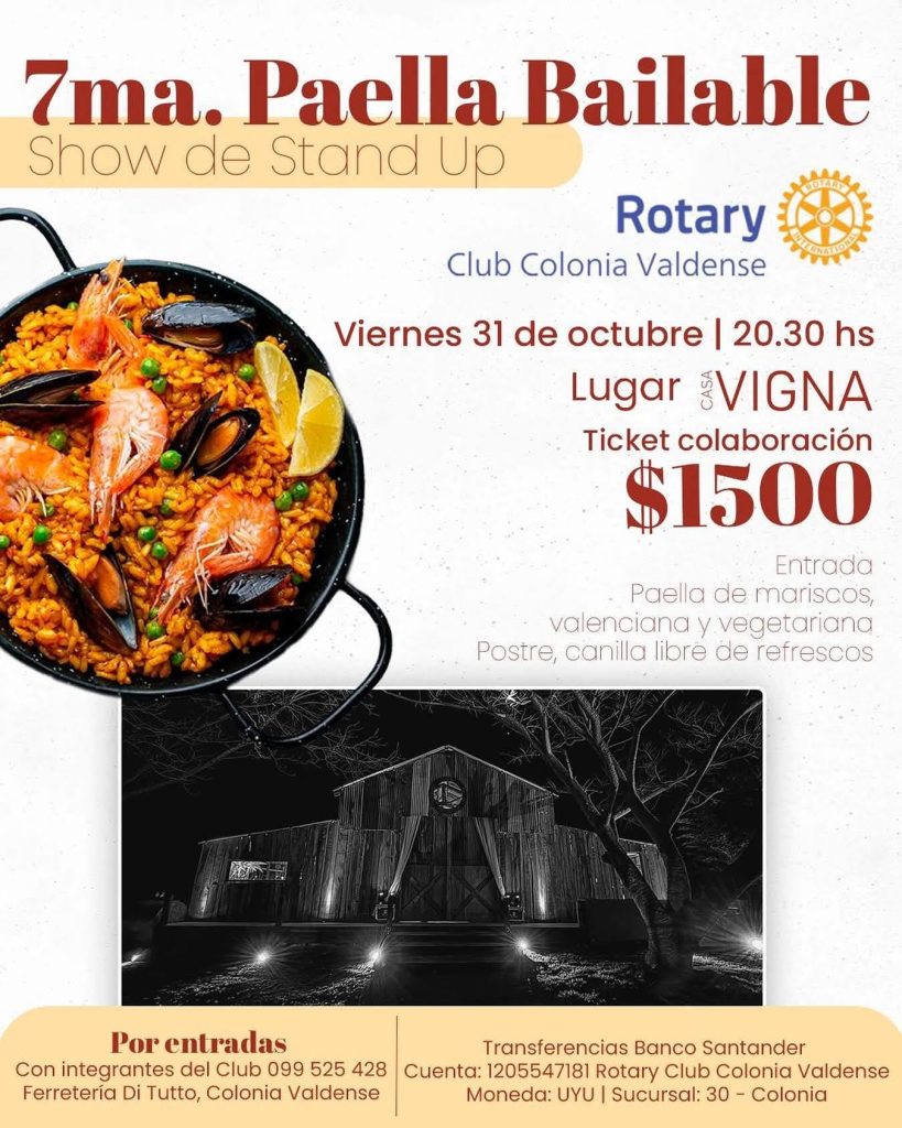 Rotary Club Colonia Valdense realiza la séptima edición de la Paella Bailable solidaria, que este año cambia de escenario y se realizará este viernes 31 de octubre, a las 20:30 hrs., en Casa Viña, en Ruta 51.