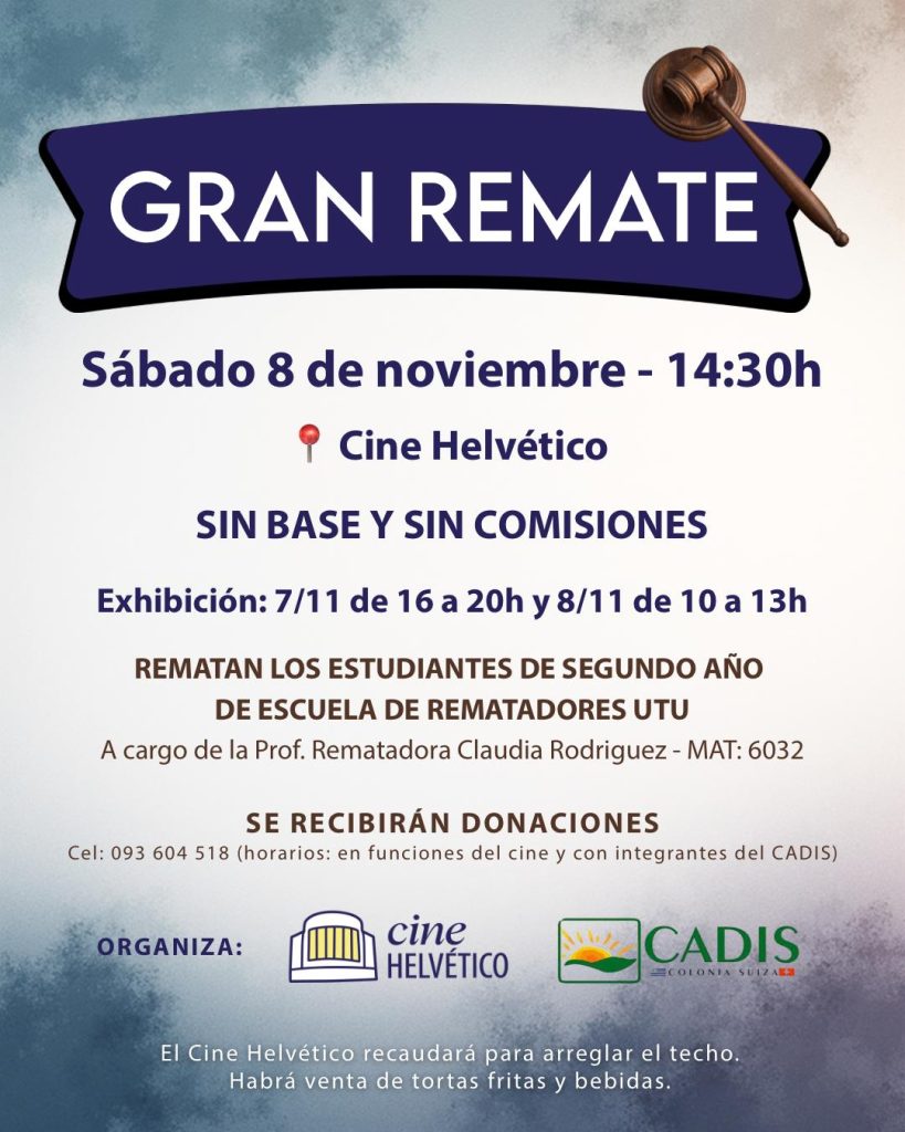 El evento, organizado por el propio cine junto al CADIS, será sin base y sin comisiones, y estará a cargo de los estudiantes de segundo año de la Escuela de Rematadores de UTU, bajo la supervisión de la rematadora Claudia Rodríguez.