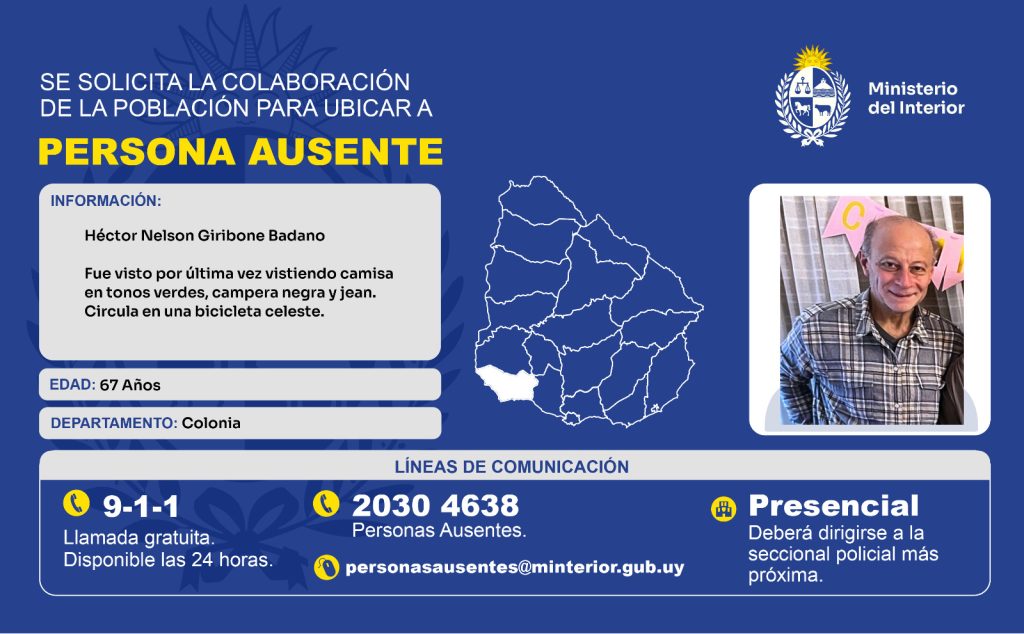 El Ministerio del Interior, a través de la Jefatura de Policía de Colonia, había difundido este miércoles un pedido de colaboración para dar con su paradero. Giribone había salido en bicicleta desde su domicilio el martes y no había regresado.