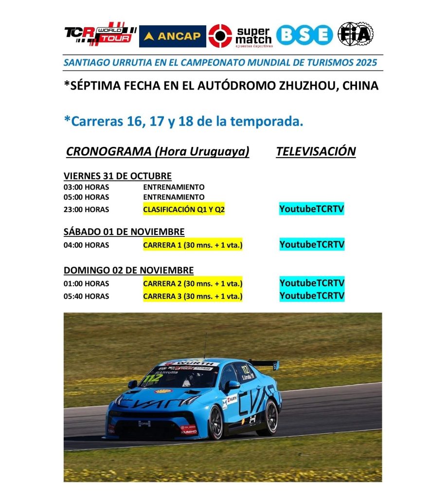 El piloto coloniense Santiago Urrutia disputa este fin de semana la séptima fecha del Campeonato Mundial de Turismos 2025 en el autódromo de Zhuzhou, China, escenario de las carreras 16, 17 y 18 de la temporada.