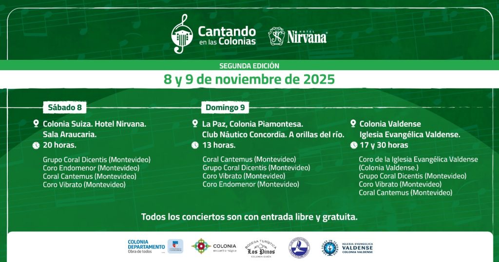 Hora 17:30 = Colonia Valdense, Templo de la Iglesia E. Valdense. Participan: Coro de la Iglesia E. Valdense local, Grupo Coral Dicentis (Montevideo), Coro Vibrato (Montevideo) y Coral Cantemus (Montevideo).