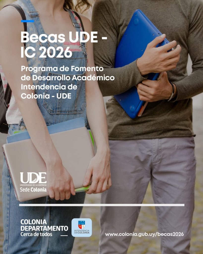 La Intendencia de Colonia y la Universidad de la Empresa (UDE), en el marco del programa de Fomento del Desarrollo Académico, informan que continúa abierto el llamado a inscripción para las becas 2026.