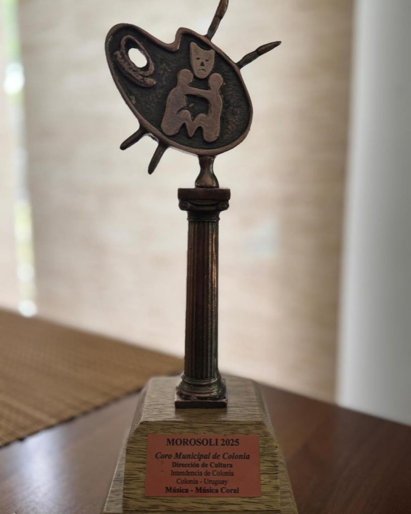 El director del Coro Municipal, Fernando Maddalena, y el coreuta Carlos Torres recibieron la estatuilla con la inscripción: “Morosoli 2025. Coro Municipal de Colonia, Dirección de Cultura Intendencia de Colonia, Colonia-Uruguay. Música – Música Coral”.