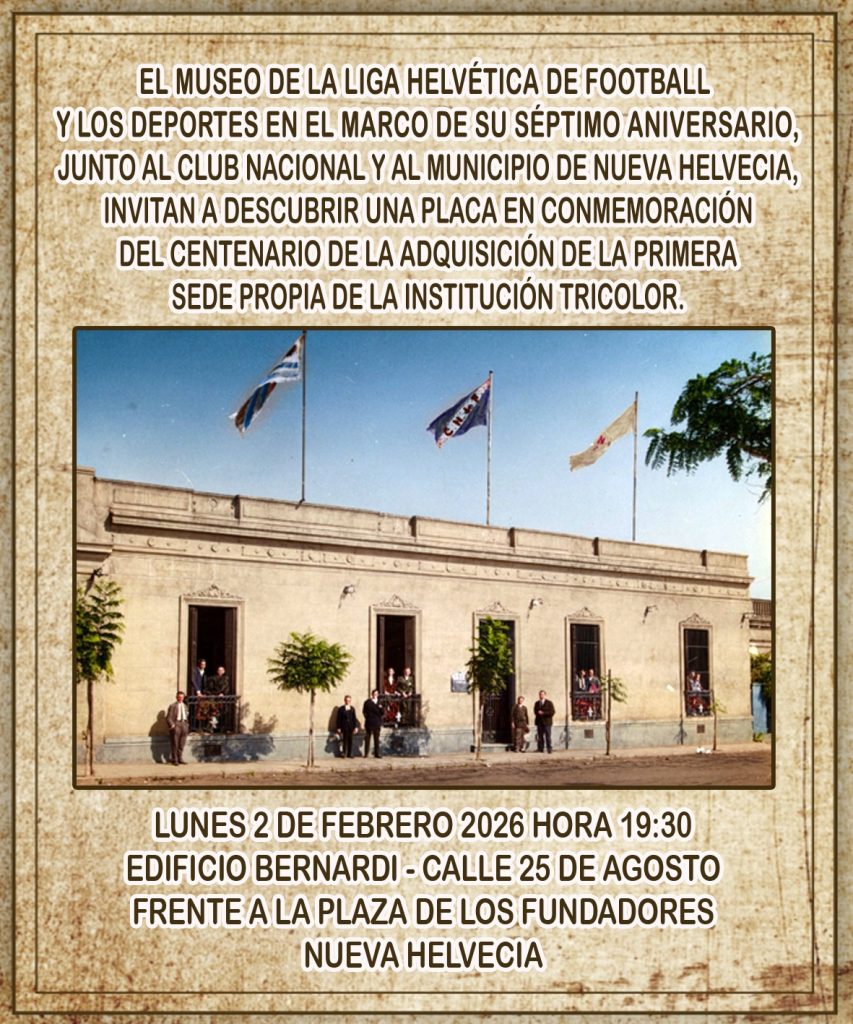 En el marco de su séptimo aniversario, el Museo de la Liga Helvética de Football y los Deportes, junto al Club Nacional y al Municipio de Nueva Helvecia, realizarán un acto conmemorativo por el centenario de la adquisición de la primera sede propia del Club Nacional.