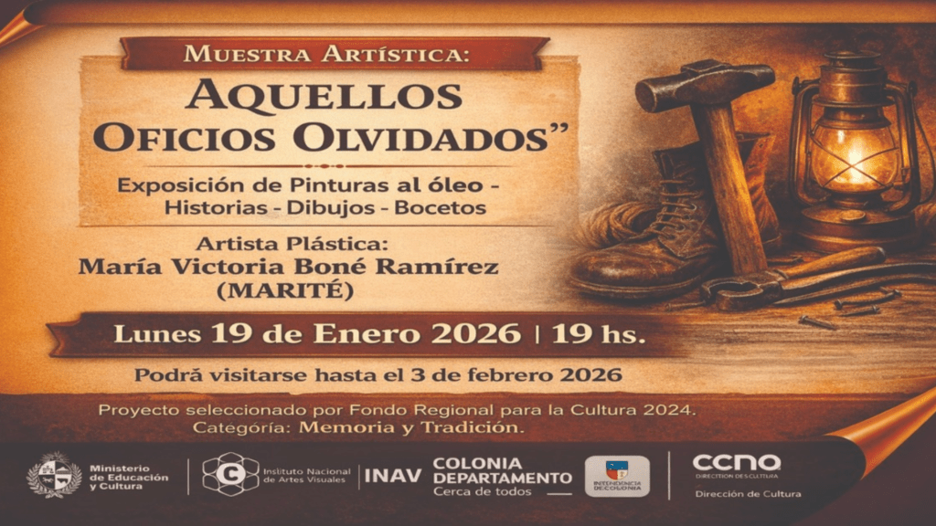La Dirección de Cultura informa que hoy lunes a las 19 horas, se realizará la inauguración de la muestra artística “Aquellos oficios olvidados”, en el Centro Cultural Nacional AFE de Colonia del Sacramento.