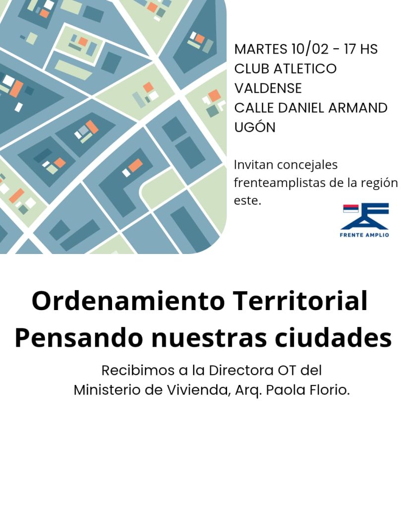 Hoy martes 10 de febrero, a las 17:00 horas, en salones del Club A. Colonia Valdense, se realizará una reunión abierta a todo público, sobre “Ordenamiento Territorial pensando en nuestras ciudades”. En esta reunión se estará recibiendo a la Directora de Ordenamiento Territorial del Ministerio de Vivienda, Arquitecta Paola Florio. Invitan a participar de esta instancia, los Concejales del Frente Amplio de la micro región.