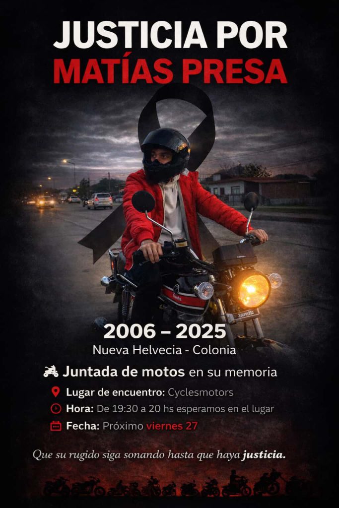 Familiares, amigos y vecinos convocan a una juntada de motos en memoria de Matías Presa, el joven fallecido recientemente, bajo la consigna “Justicia por Matías Presa”.
