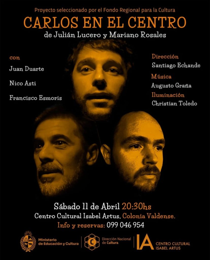 El Centro Cultural Isabel Artús de Colonia Valdense será escenario de una propuesta teatral este sábado 11 de abril, a las 20:30 horas, con la presentación de la obra “Carlos en el Centro”, dirigida por Santiago Echande.