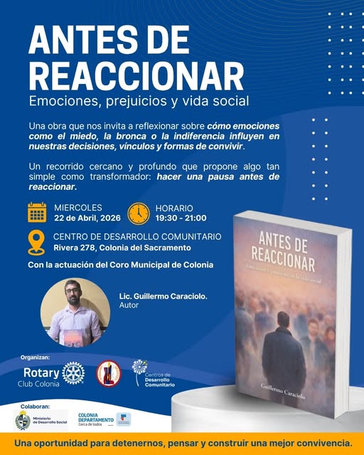 La jornada culminará a las 19:30 horas con la presentación abierta y gratuita del libro Antes de reaccionar: emociones y prejuicios en la vida social, del licenciado Guillermo Caraciolo, en el Centro de Desarrollo Comunitario.