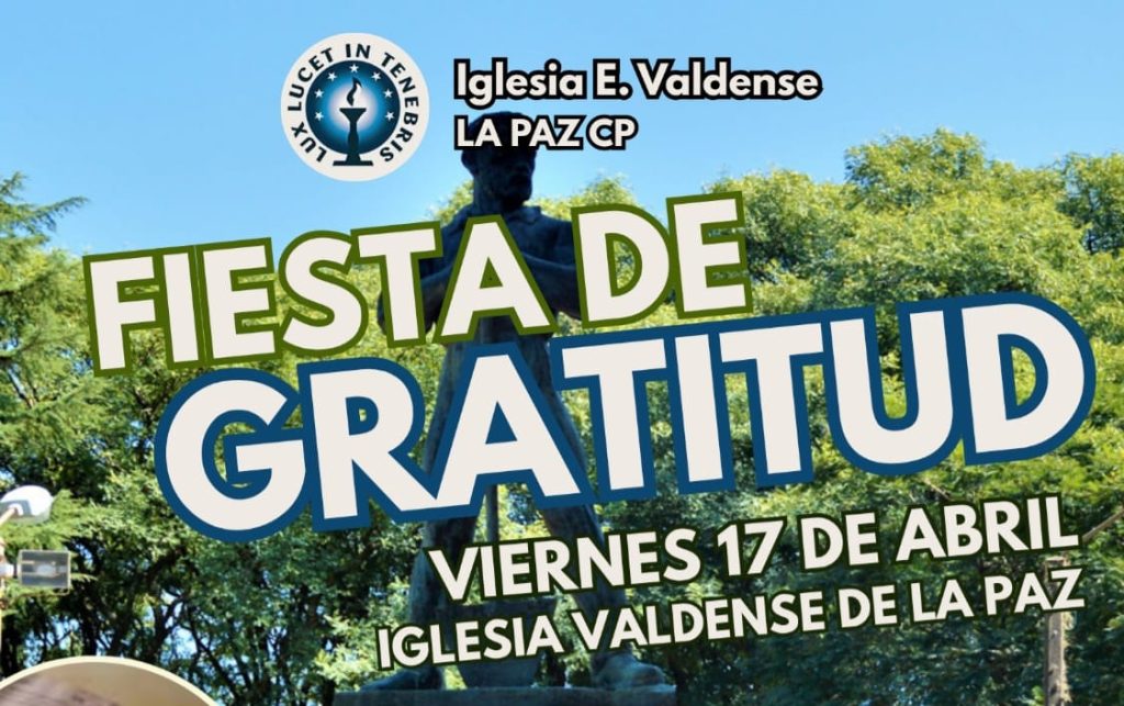 Se realiza hoy viernes 17 de abril, a las 19:30 horas, la Fiesta de Gratitud en la Iglesia E. Valdense de La Paz C.P., comenzando con culto de acción de gracias. Posteriormente habrá cena, amenizada por música de piano.
