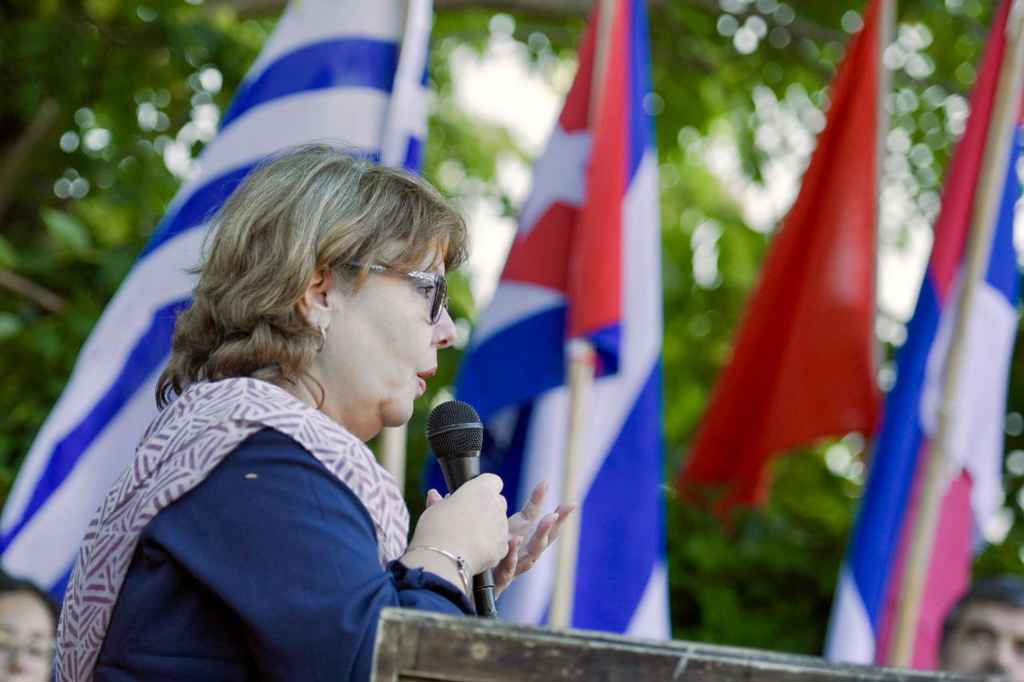 La diplomática desarrolló una exposición centrada en la coyuntura actual de la isla, con énfasis en el escenario internacional y en los efectos del prolongado bloqueo económico aplicado por Estados Unidos.